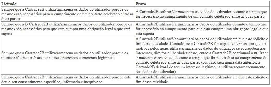 O período de tempo durante o qual a Cartrade2B armazenará os dados do utilizador depende da licitude subjacente à utilizados dos mesmos, conforme descrito abaixo: