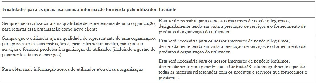 As finalidades específicas para as quais a Cartrade2B utilizará a informação pessoal do utilizador, e licitude aplicável, são as seguintes: